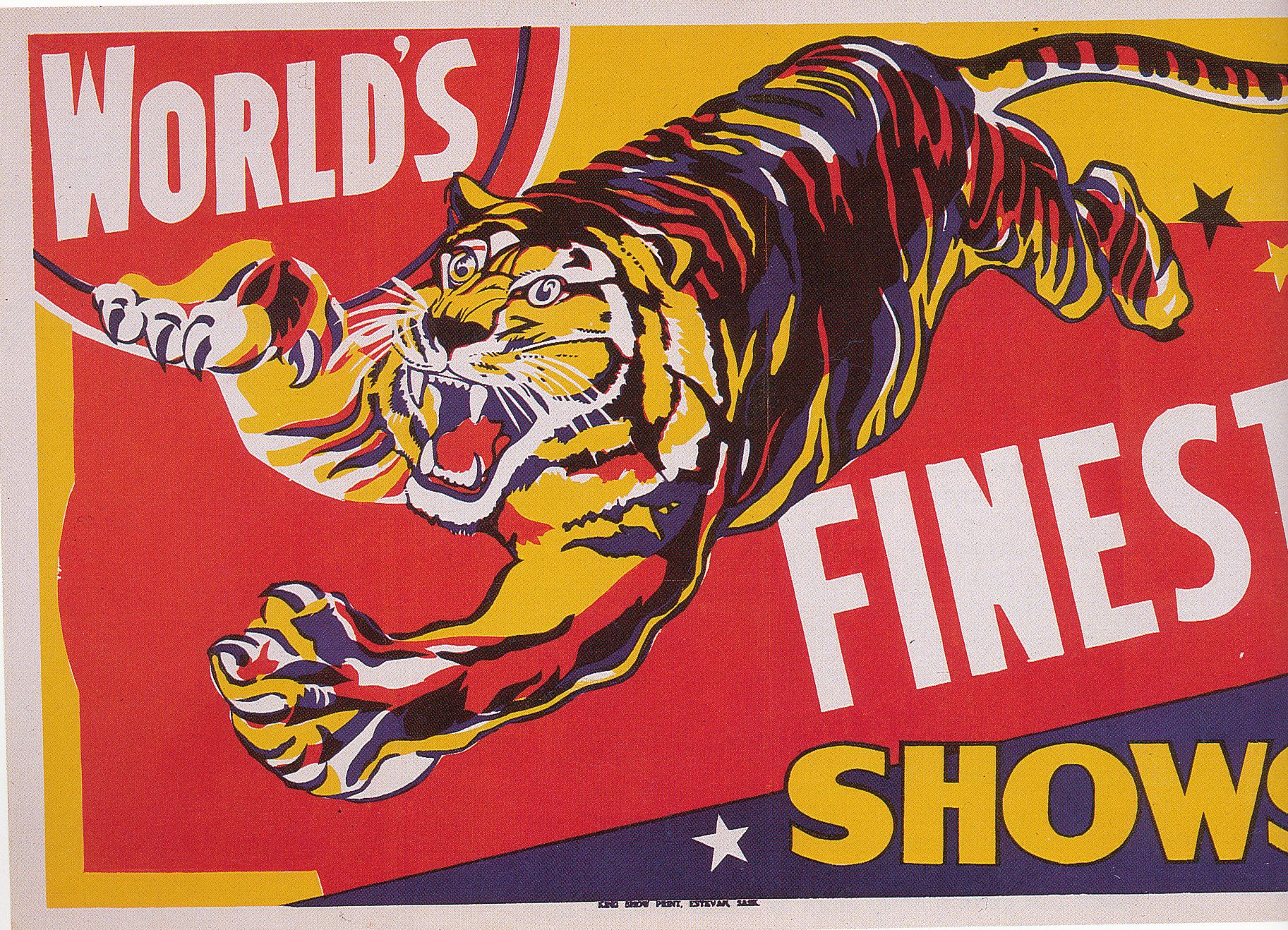 "During the late nineteenth and early twentieth centuries traveling circuses were among the biggest and most innovative of entertainment promoters. Faced with the formidable task of marketing its show in hundreds of towns each year, circuses pioneered the strategy of saturating small communities with print advertising. They filled every possible corner using window cards, posters on telephone poles, and multi-sheet giant billboards plastered on farm barns that could as King said 'be seen a mile away'.